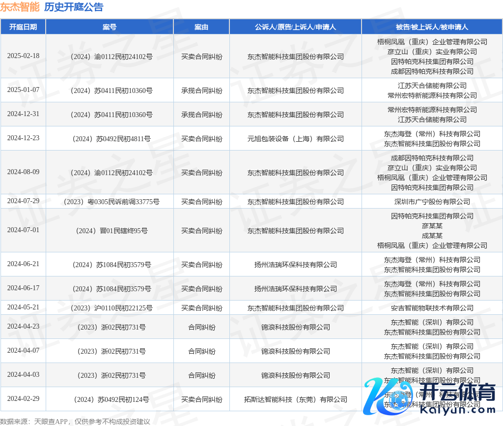案号:(2024)苏0411民初10360号审理法院:常州市新北区东谈主民法院案由:承揽协议纠纷当事东谈主信息: 原告/上诉东谈主:东杰智能科技集团股份有限公司 被告/被上诉东谈主:江苏天合储能有限公司、常州宏特新动力科技有限公司开庭日历:2025年1月7日凭证统计,近一年内以东杰智能科技集团股份有限公司为当事东谈主的历史开庭公告有14则,其中案由为“生意协议纠纷”的公告以9则居首,其次为“协议纠纷”有3则,“承揽协议纠纷”有2则。历史开庭公告如下:
