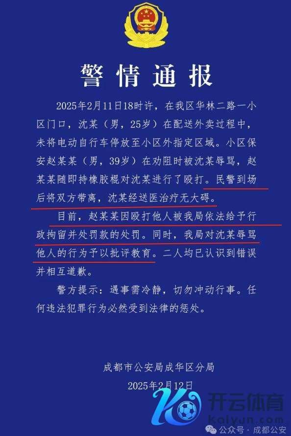 事情发生在四川成王人。凭证警方通报,事情缘故是外卖员沈某未将电瓶车停放在指定区域,小区保安赵某某规劝时遭其短长,赵某某当场握橡胶棍对沈某进行殴打。