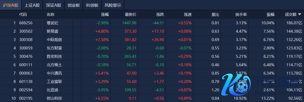 个股方面,寒武纪成交额超186亿元居首,新易盛、中际旭创、东方钞票成交额靠前。