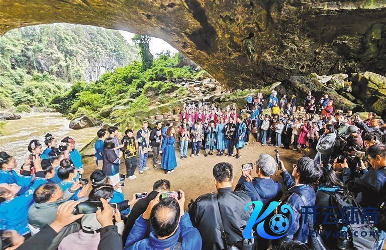3月24日,肇兴天生桥景区,好意思国耶鲁大学威芬普夫斯阿卡贝拉齐唱团与当地大众同台对歌。本报记者 王新伟摄