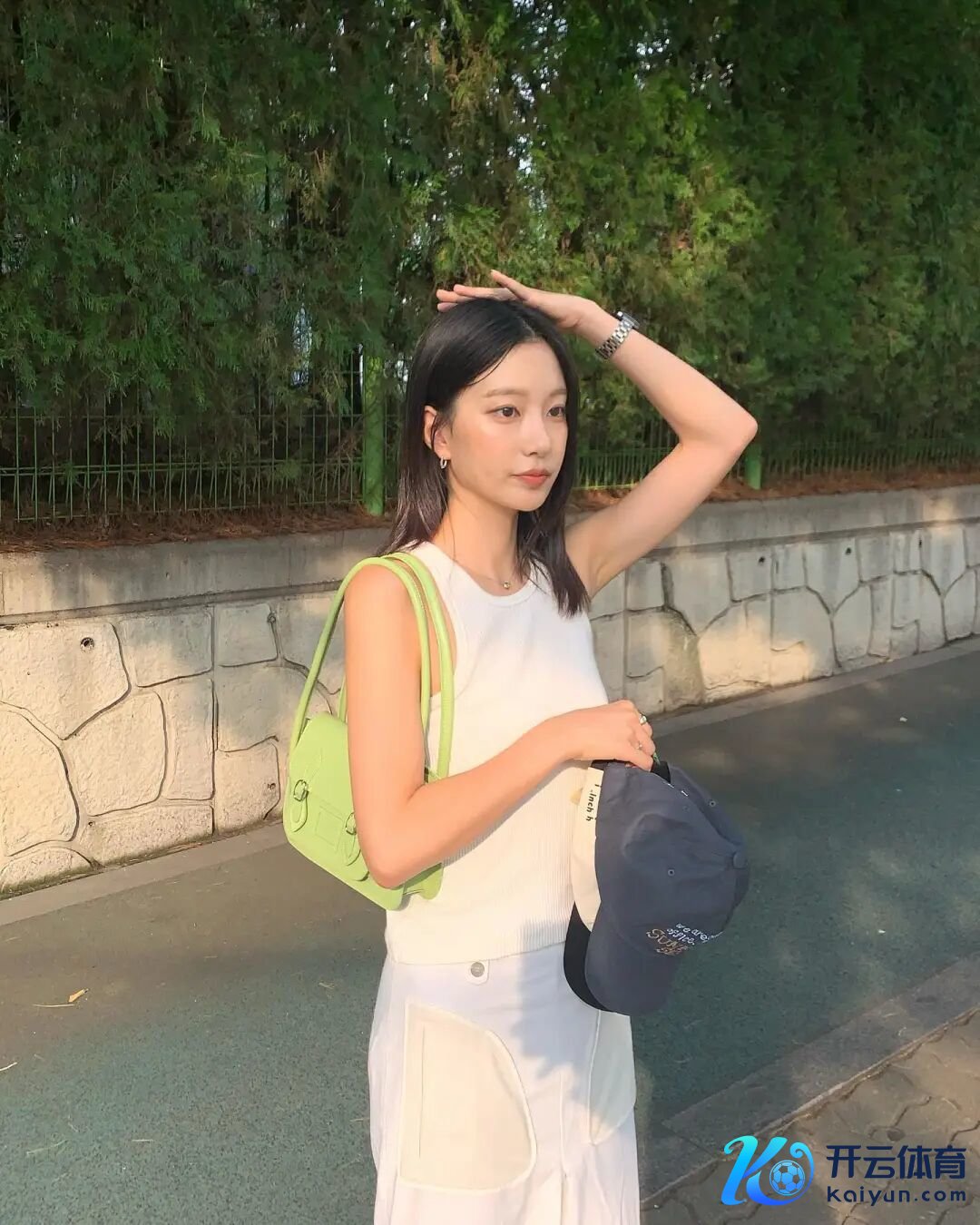 杨采钰曾以缎面薄荷绿上衣配绒感嫩黄下装,一凉一暖,一转一柔,色调有了呼吸,东谈主也显得通透。