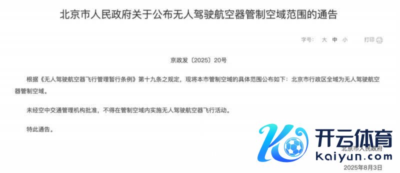8月3日,北京市政府发布《北京市东谈主民政府对于公布无东谈主驾驶航空器料理空域范围的晓示》(以下简称《晓示》),限定北京市行政区全域为无东谈主驾驶航空器料理空域。未经空中交通处置机构批准,不得在料理空域内推行无东谈主驾驶航空器飞翔动作。
